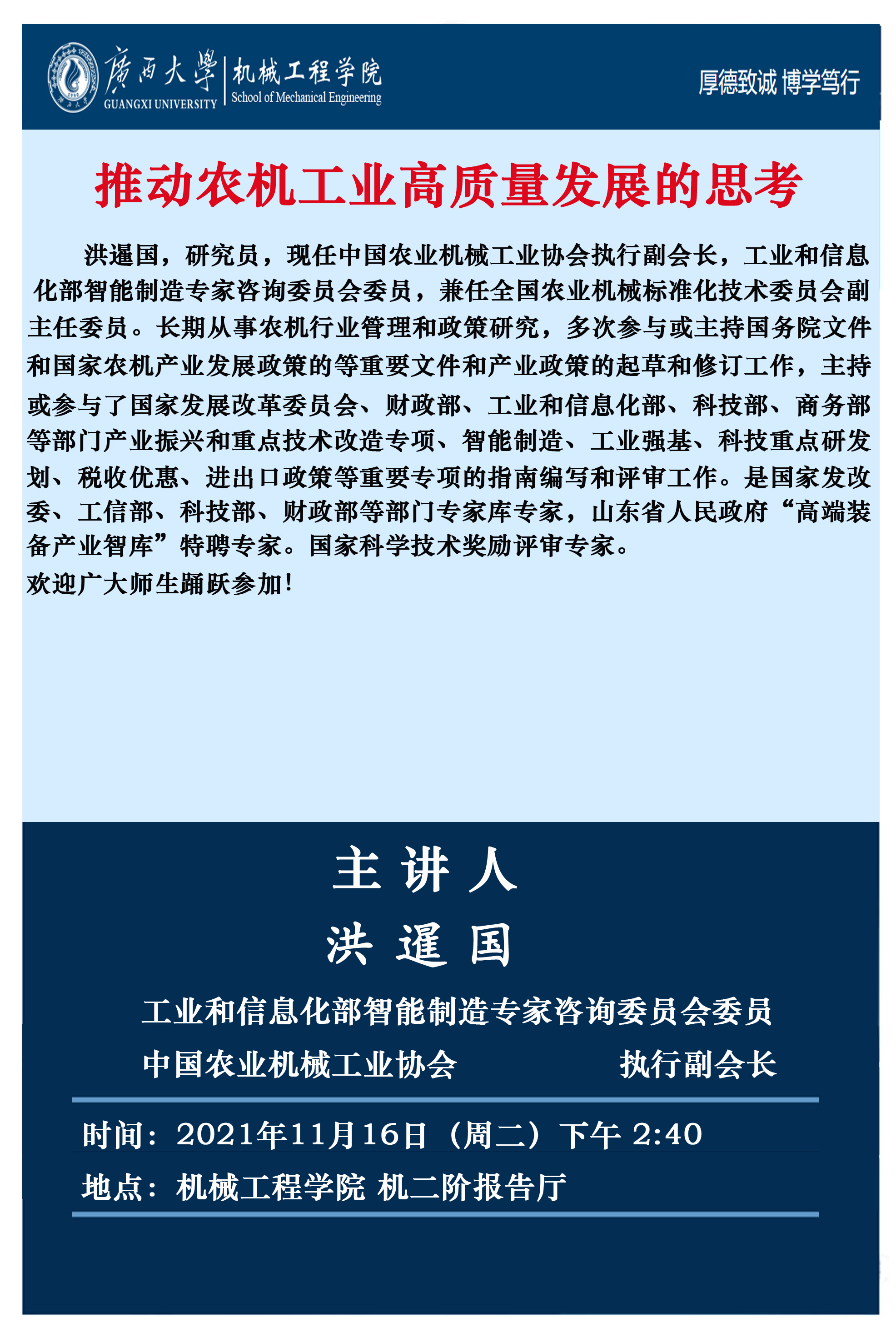 机械工程学院学术报告:推动农机工业高质量发展的思考