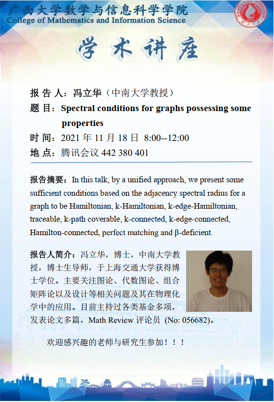 数信学院学术报告:Spectral conditions for graphs possessing some properties