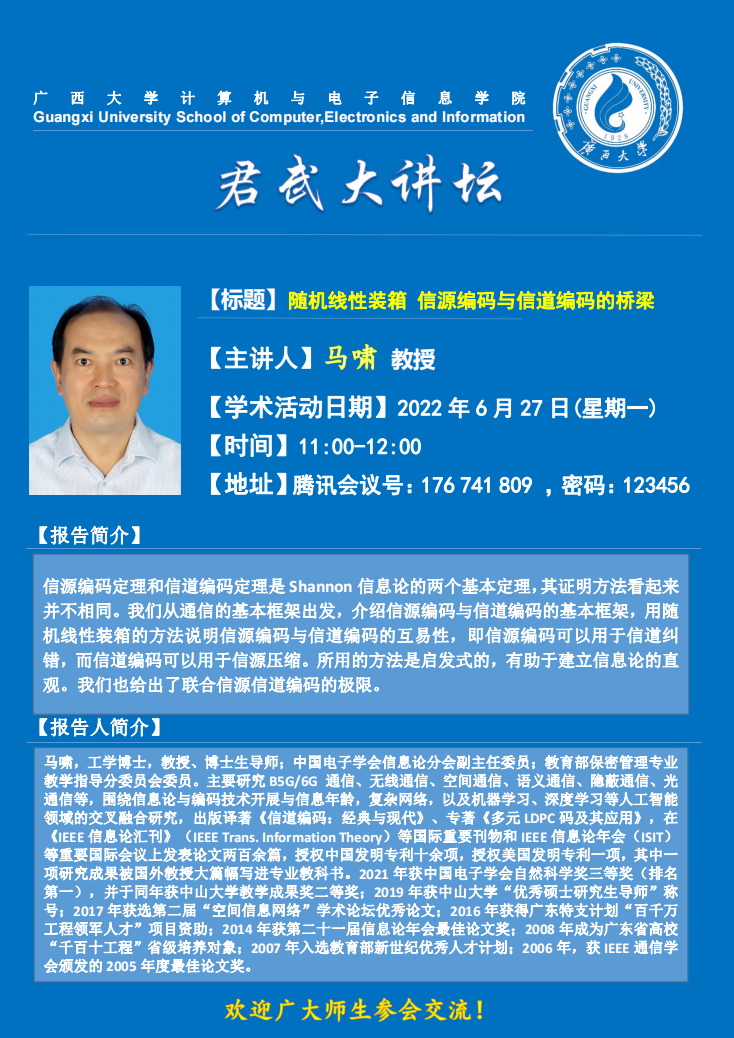 计算机与电子信息学院学术报告:随机线性装箱信源编码与信道编码的桥梁