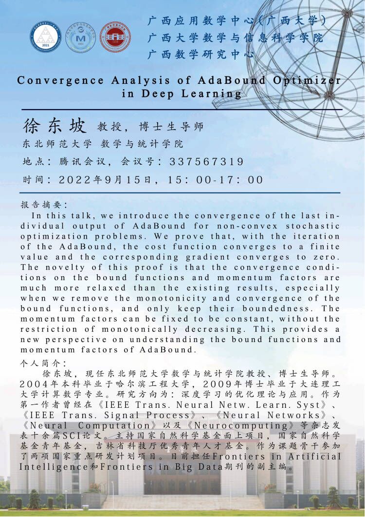 数学与信息科学学院 广西应用数学中心(欧冠官方网站)学术报告:Convergence Analysis of AdaBound Optimizer in Deep Learning