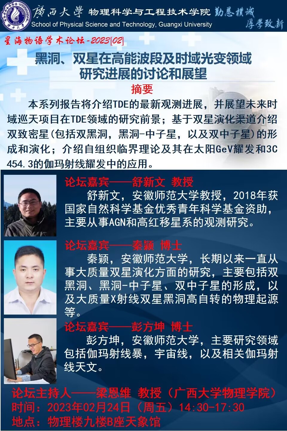 物理学院2023年星海物语学术论坛(第二期):黑洞、双星在高能波段及时域光变领域研究进展的讨论和展望