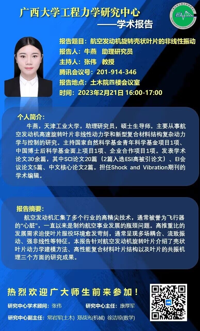 欧冠官方网站工程力学研究中心学术报告:航空发动机旋转壳状叶片的非线性振动