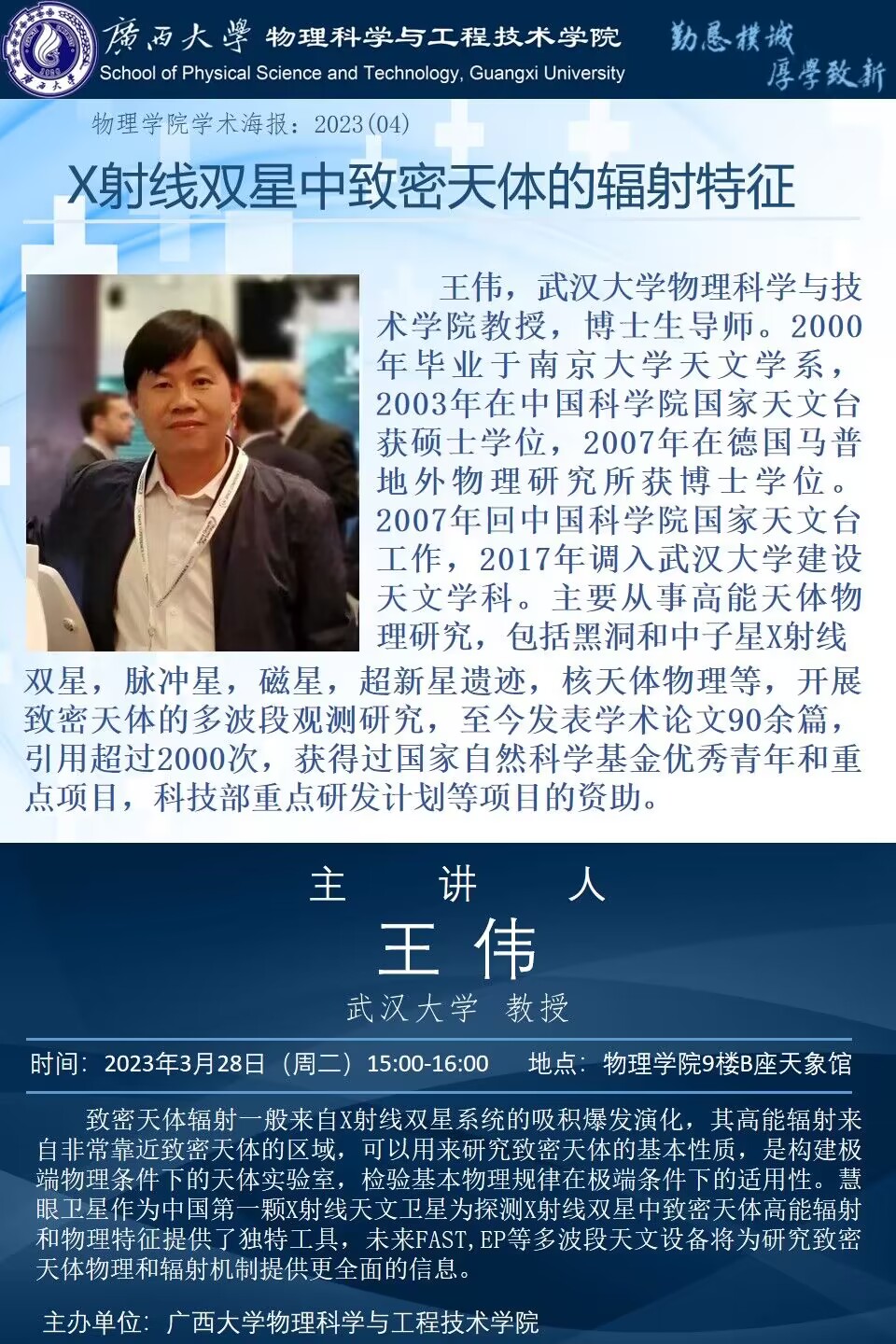 主讲人 王伟 地址 物理学院9楼B座天象馆