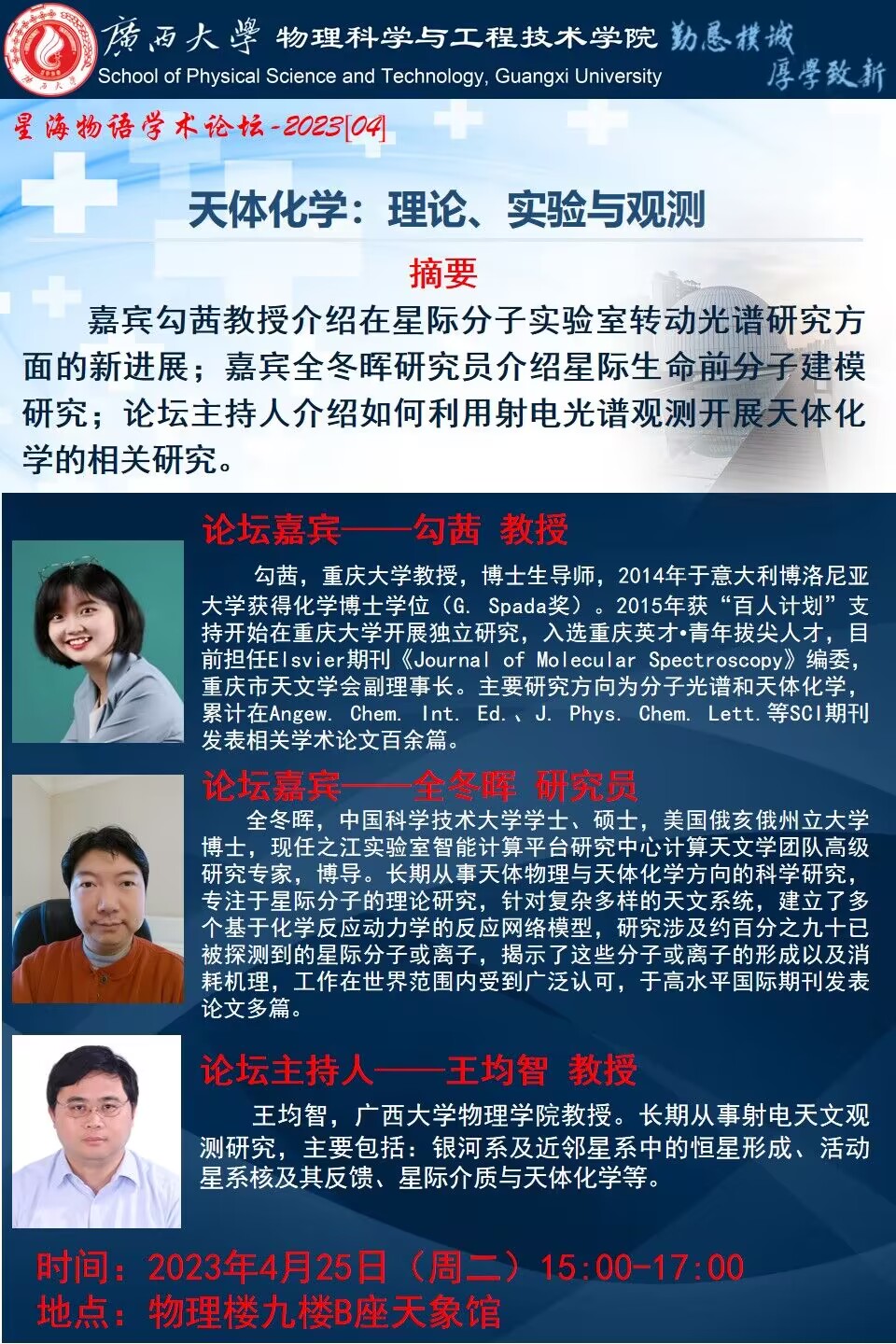 物理学院2023年星海物语学术论坛(第四期):天体化学:理论、实验与观测