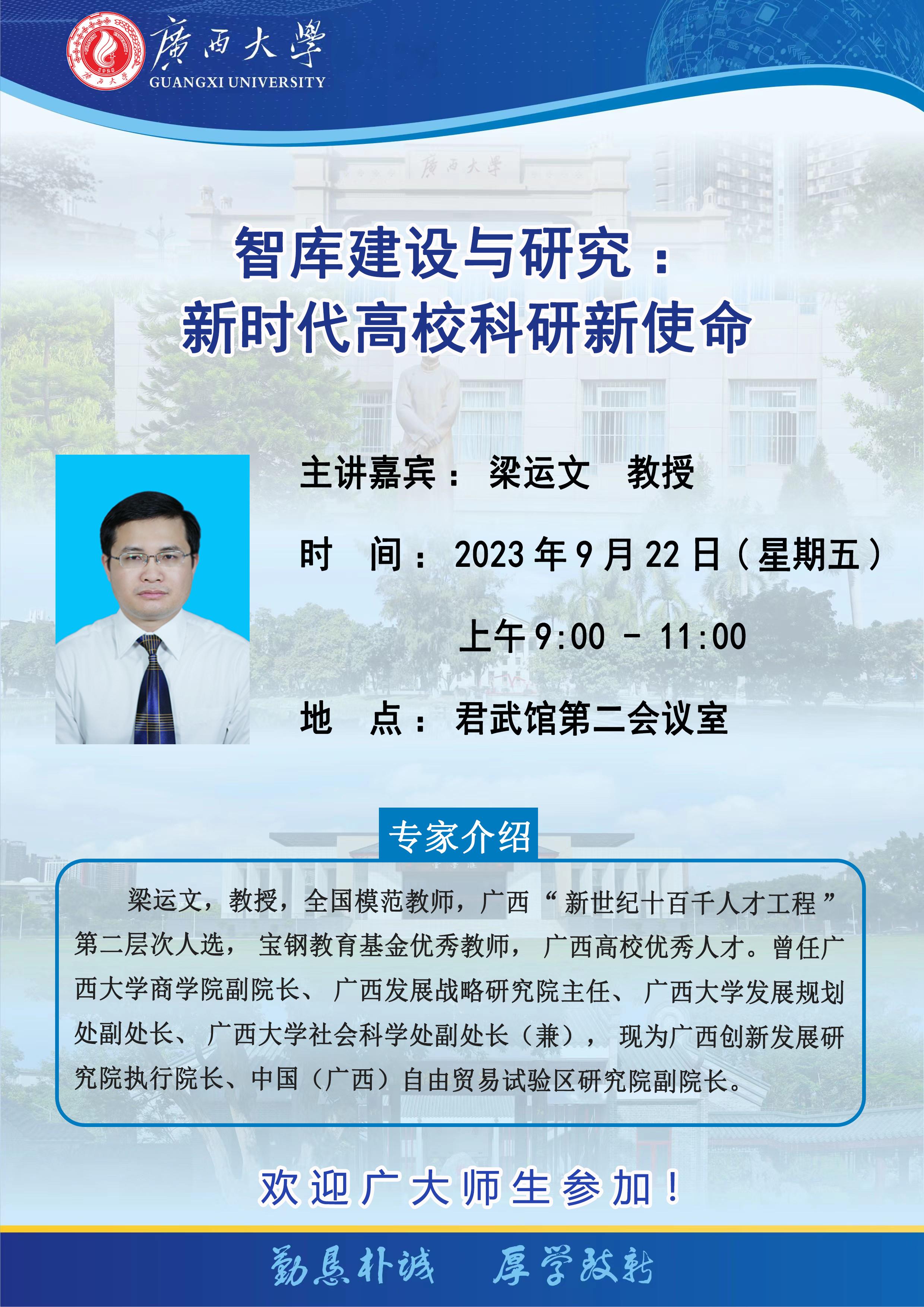 梁运文,教授,全国模范教师,广西“新世纪十百千人才工程”第二层次人选,宝钢教育基金优秀教师,广西高校优秀人才。曾任欧冠官方网站商学院副院长、广西发展战略研究院主任、欧冠官方网站发展规划处副处长、欧冠官方网站社会科学处副处长(兼),现为广西创新发展研究院执行院长、中国(广西)自由贸易试验区研究院副院长。