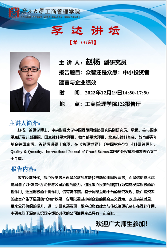 李达讲坛第131期 : 众智还是众愚——中小投资者建言与企业绩效