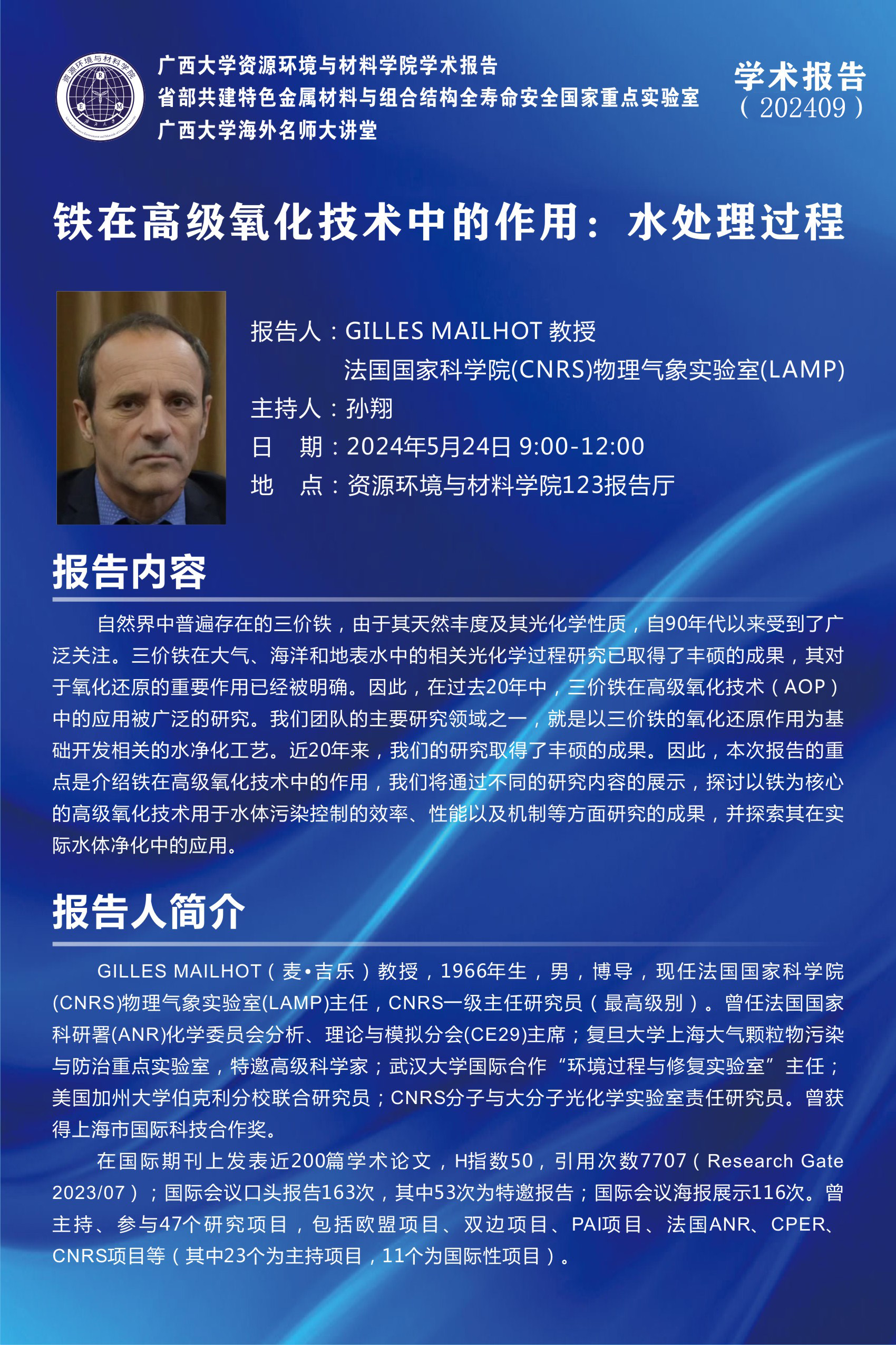 欧冠官方网站海外名师大讲堂、资源环境与材料学院学术报告 :铁在高级氧化技术中的作用----水处理过程