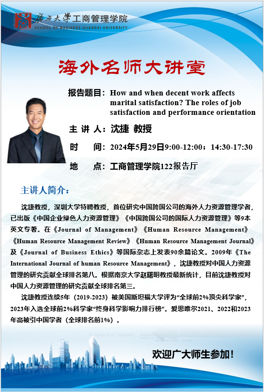 海外名师大讲堂:How and when decent work affectsmarital satisfaction? The roles of iobsatisfaction and performance orientation