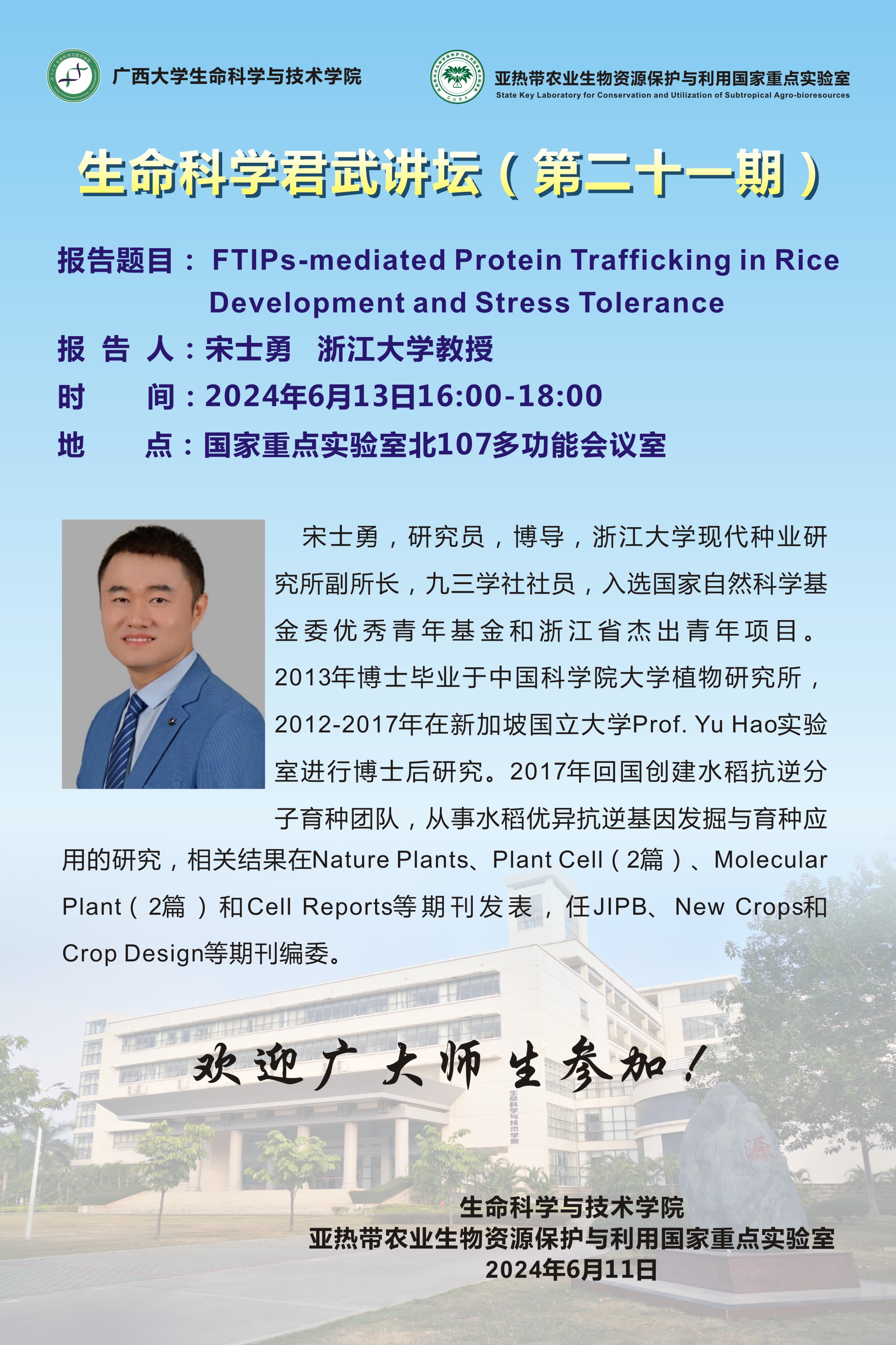 生命科学君武讲坛(第二十一期):FTIPs-mediated Protein Trafficking in Rice Development and Stress Tolerance