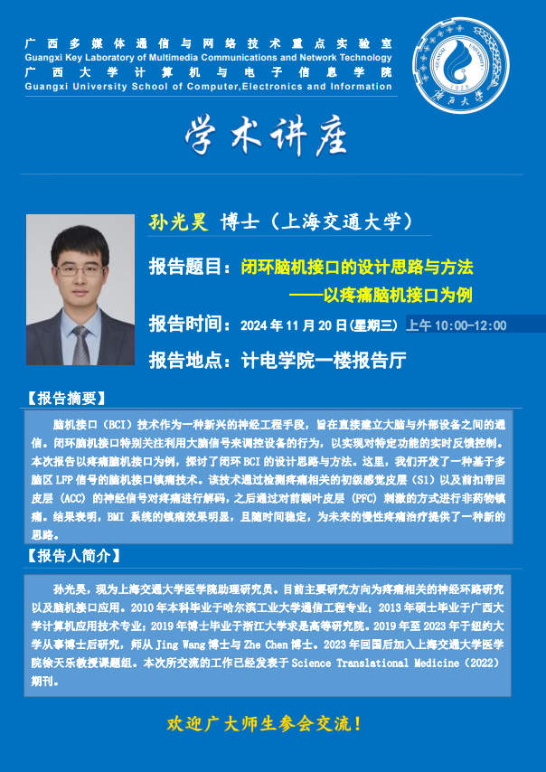 “计电讲坛”第23期学术报告:闭环脑机接口的设计思路与方法——以疼痛脑机接口为例
