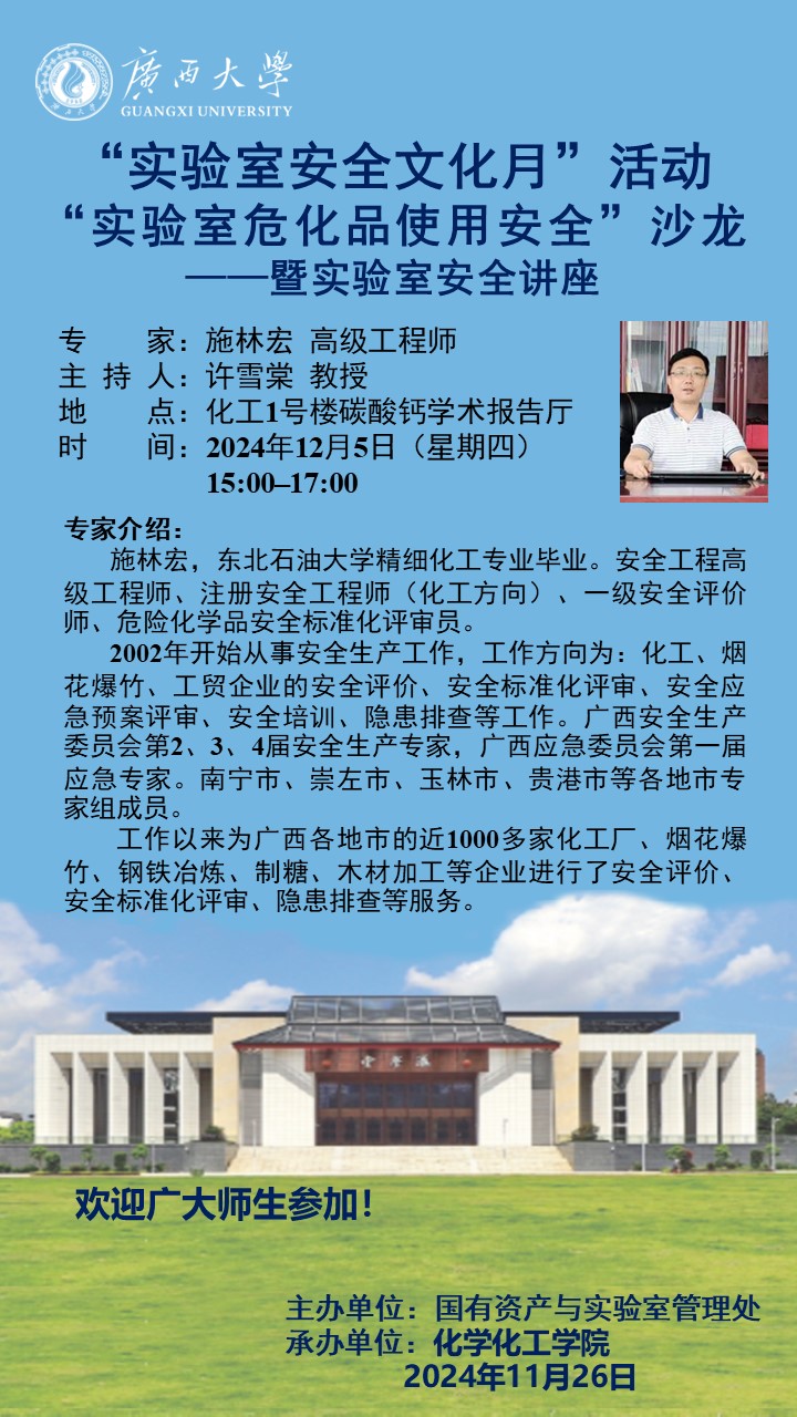 化学化工学院学术报告 :“实验室安全文化月”主题沙龙——实验室危化品使用安全