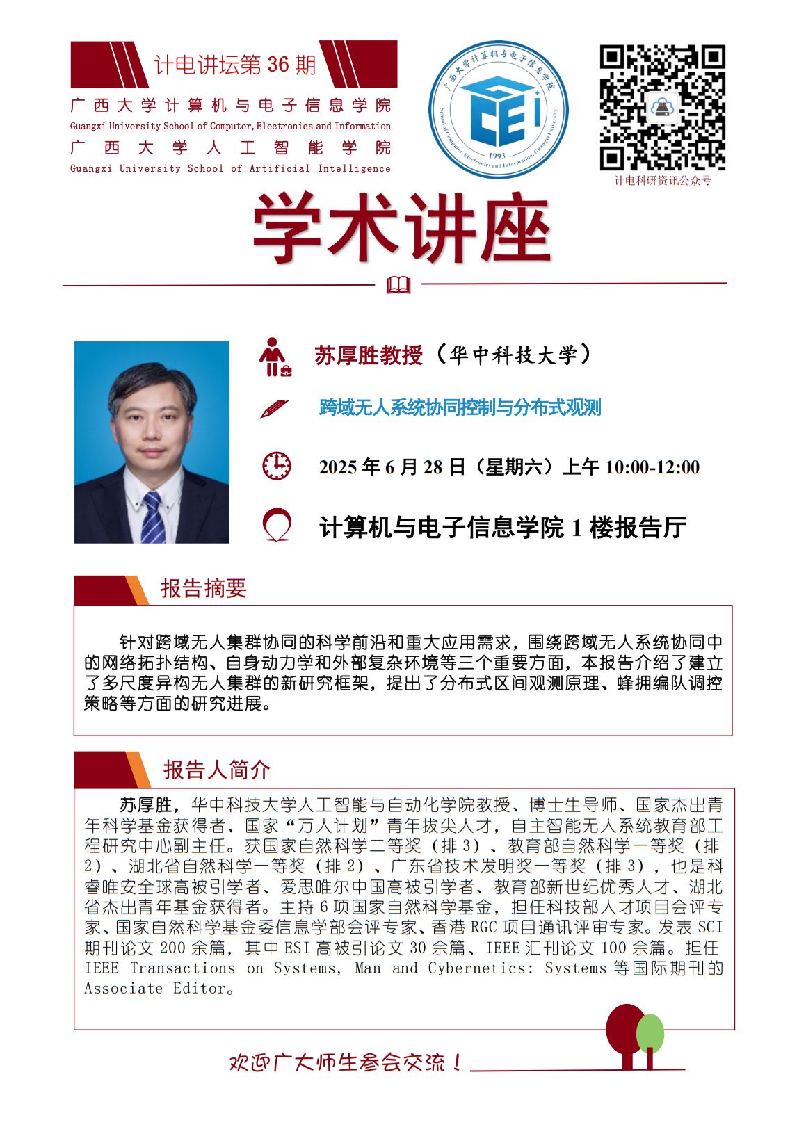 “计电讲坛”学术报告系列活动第36期 :跨域无人系统协同控制与分布式观测