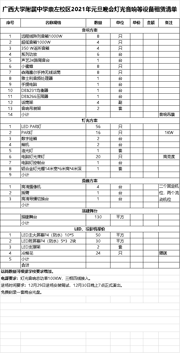 欧冠官方网站附属中学(南宁校区)2021年元旦晚会灯光音响等设备租赁清单 |