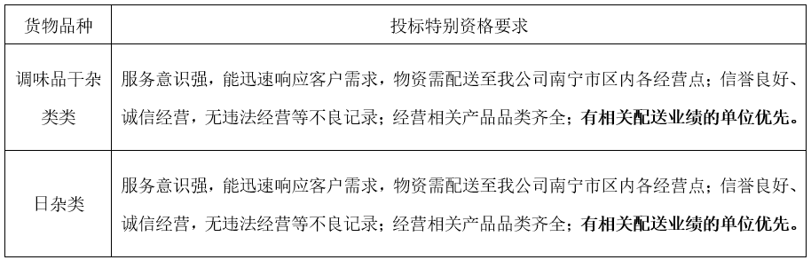 本招标项目是2024年食堂调味品干杂类、日杂类物资定点供应商招标采购,招标人(项目业主)为广西西大朴诚后勤产业服务有限公司,现对该项目进行公开招标,欢迎符合条件的供应商前来投标。
