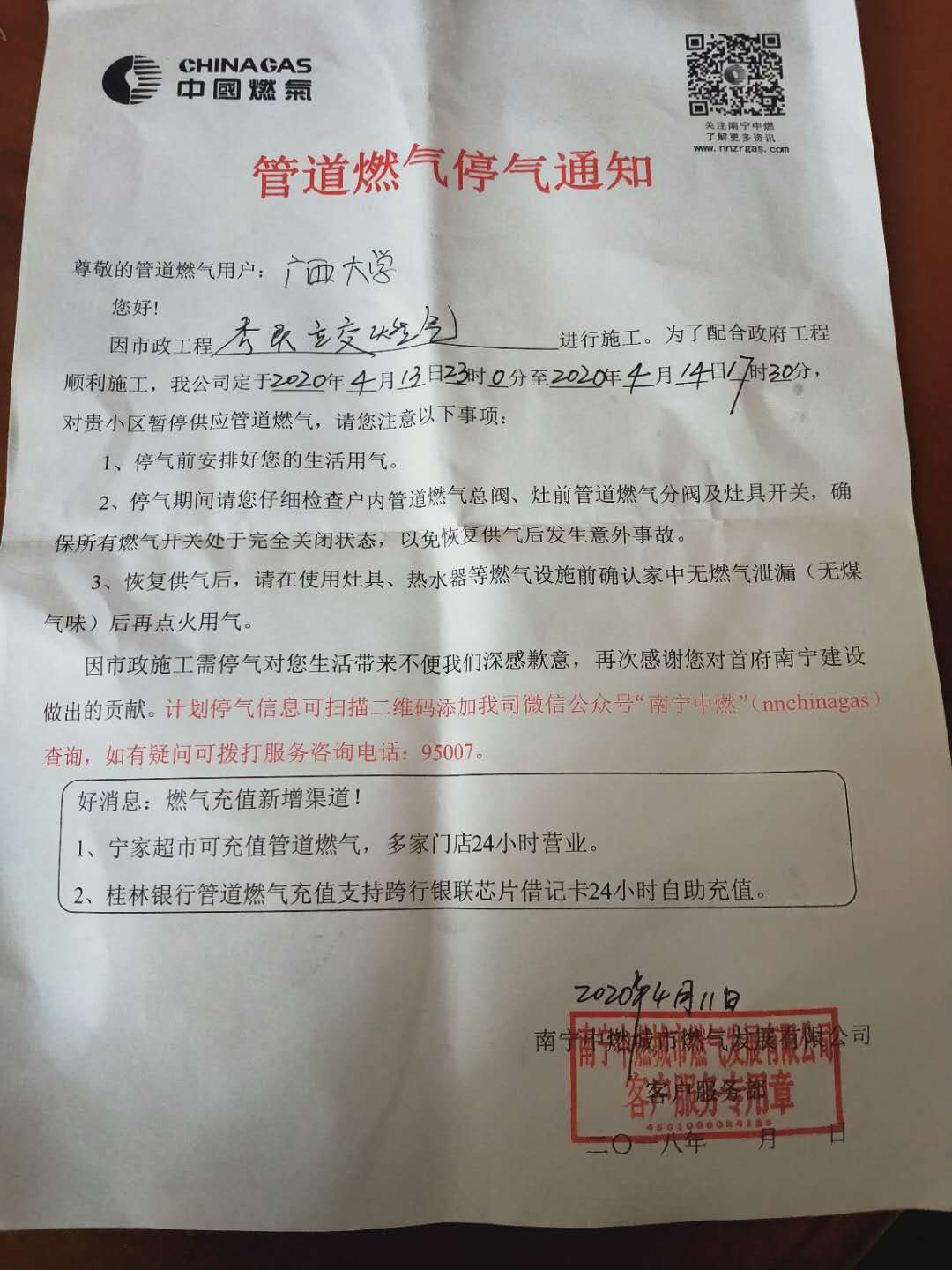 根据南宁中燃城市燃气发展有限公司客户服务部的通知,欧冠的管道燃气将于2020年4月13日23时0分至4月14日17时30分暂停供应,详见附件。请各住户做好停气准备。不便之处,敬请谅解。