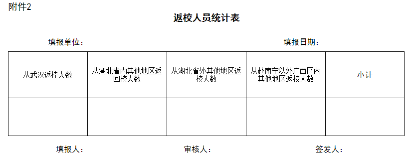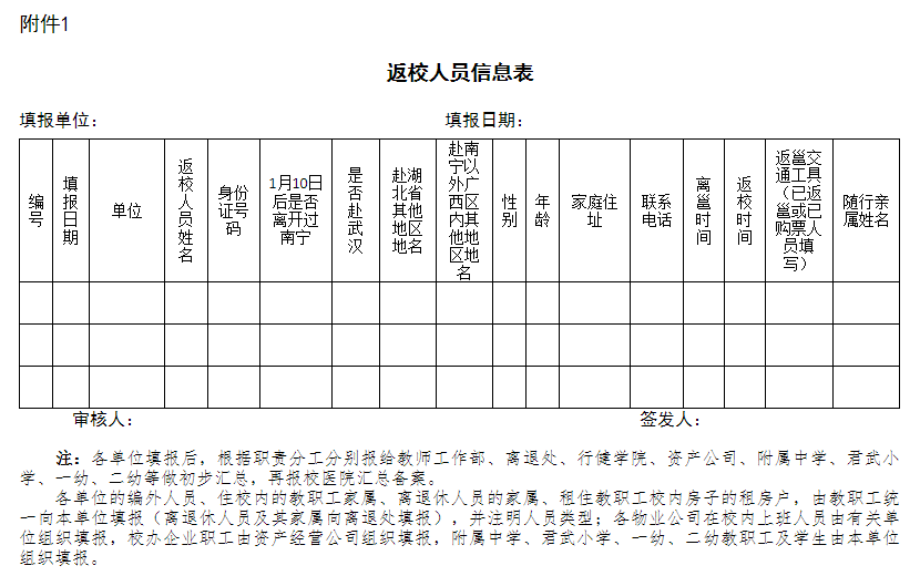 四、再次重申现在湖北境内的和近两周内有湖北等地接触史或有与确诊、疑似病例接触史的教职工及其亲属,暂时不要返校,返回时间等候学校进一步通知。学校教职员工及其亲属目前不在南宁的,如返校,需向本单位主要负责人报备,填报返校信息表。各单位每天需将该信息表与疫情情况一同上报,由校医院统一汇总备案。