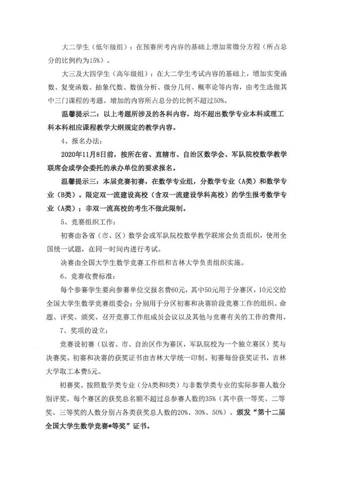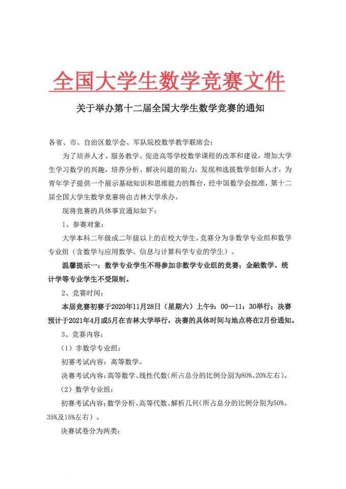 现将第十二届大学生数学竞赛参赛工作有关事宜通知如下: