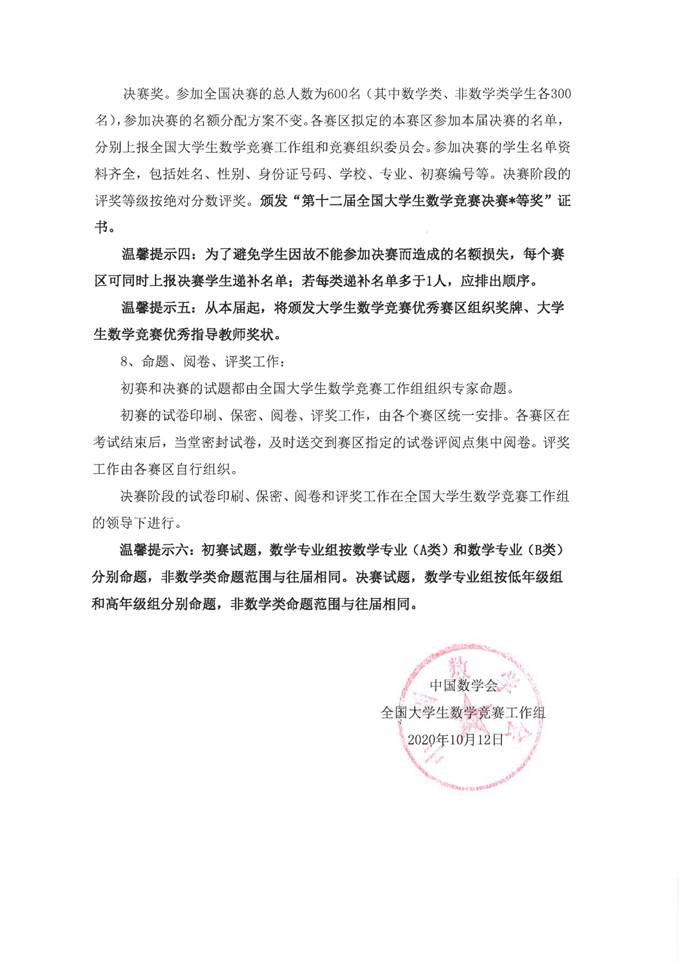 为了促进高等学校数学课程的改革和建设,激发广大学生学习数学的兴趣,培养他们分析问题和解决问题的能力,发现和选拔数学创新人才,为青年学子提供一个展示自我的舞台。中国数学会将于2020年11月28日举办第十二届全国高校大学生数学竞赛。参加这项活动,有助于全面展示欧冠高等数学教学水平和教学改革的成果,有助于学生夯实和扩展高等数学知识与基本技能,对考研学生复习高等数学和全面提高大学生数学综合运用能力起促进作用。欧冠在第一届至第十届全国大学生数学竞赛中均取得了优异的成绩。请各学院大力宣传,鼓励学生积极参赛。