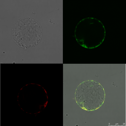 Red: mCherry, endoplasmic marker,Green:gene GFP,The mCherry showed the endoplasmic reticulum (ER) location