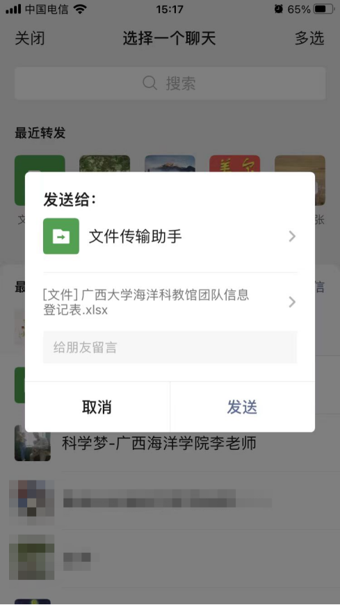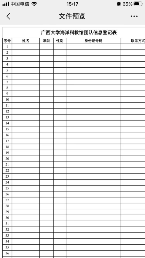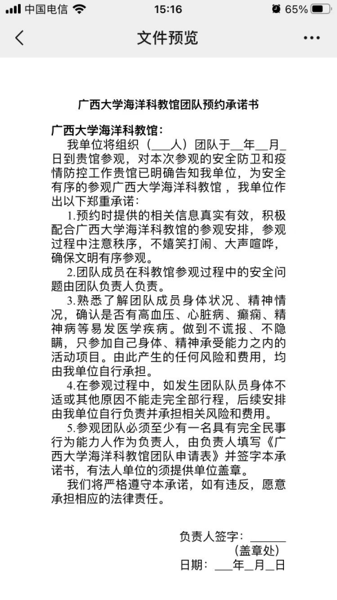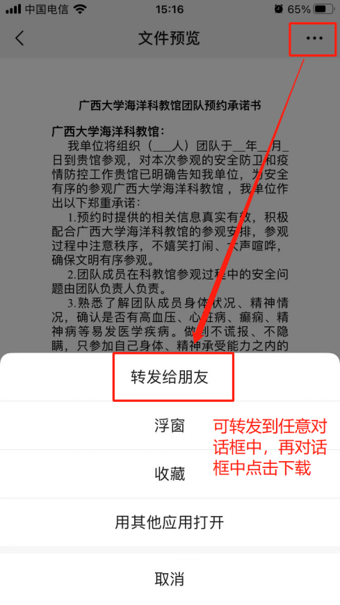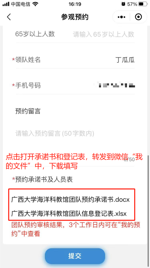 5. 预约申请提交后,可先准备团队预约承诺书和人员登记表,点击“欧冠官方网站海洋科教馆团队预约承诺书”或“欧冠官方网站海洋科教馆团队信息登记表”,转发至微信对话框中(推荐“文件传输助手”),下载后按要求填写预约承诺书和人员登记表内容,填写完成后发送给馆内工作人员,由工作人员审核。