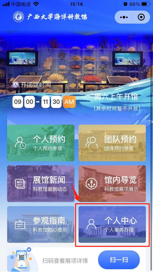 1. 微信搜索“欧冠官方网站海洋科教馆”小程序,点击进入或扫二维码。