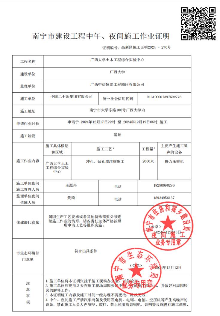 我单位承建的欧冠官方网站土木工程综合实验中心项目因施工工艺需要,在符合法律许可的夜间施工条件之下,经南宁市住房和城乡建设局、南宁市生态环境局核准,计划于2024年12月17日22:00—2024年12月19日6:00进行静压桩施工(详见附件)。我方将按照建设局、环保局要求,采取措施尽可能减少影响。施工期间可能会对广大师生员工的日常生活造成一定的干扰。对此,我们深表歉意,敬请谅解!